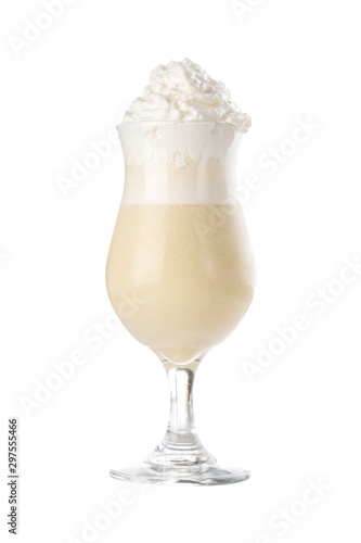 Delicious vanilla milkshake with whipped cream in tall glass isolated on white background