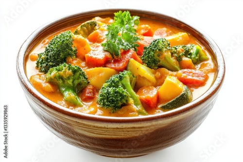 Delicious Vegan Curry Vegetable Dish Featuring Broccoli Carrots and Parsley in a Rustic Bowl Studio Shot