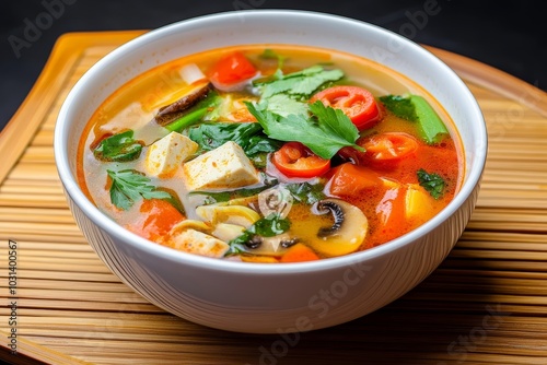 Delicious vegan tom yum soup with tofu mushrooms and fresh vegetables for a healthy meal
