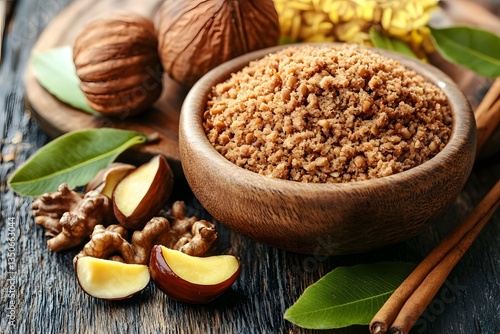 Delicious Walnut and Ginger Crumble in Wooden Bowl