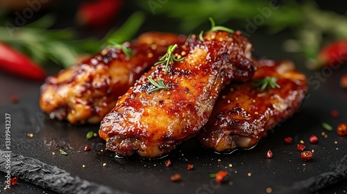 Deliciously glazed wings, perfectly cooked and ready to eat. A close-up shot highlights the glistening, golden-brown surface of the wings, garnished with fresh herbs
