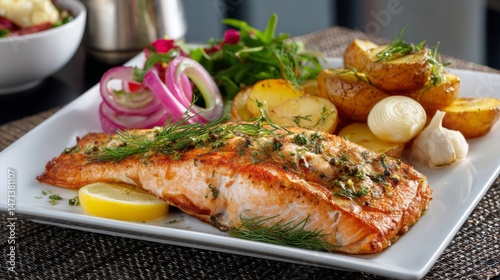Deliciously Grilled Salmon with Seasoned Potatoes and Fresh Greens