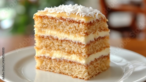 Deliciously Moist Cake Slice with Cream Filling and Coconut Topping