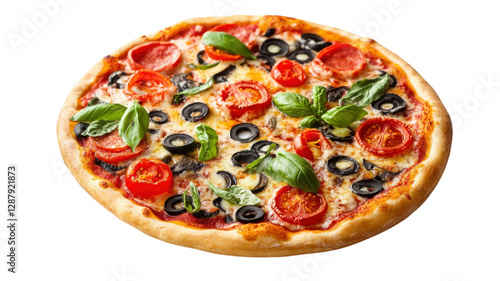 Deliciously prepared pizza topped with fresh tomatoes, olives, and basil on a wooden surface ready to be served