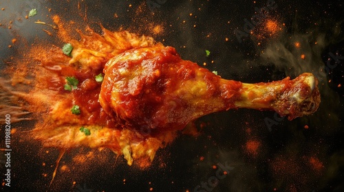 Deliciously Spicy Chicken Drumstick Being Tossed In Red Sauce Surrounded By Flavorful Spices In A Dramatic Culinary Explosion Scene Against A Dark Background