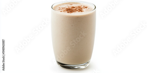 Delight in a glass of creamy horchata, topped with cinnamon, set against a bright white background