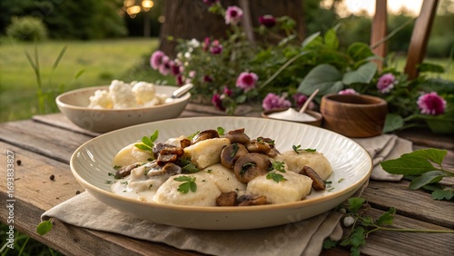 Delightful bryndzove halusky topped with mushrooms served on a rustic plate in a serene outdoor setting