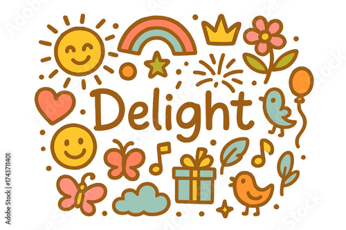 Delightful Doodle Icons. Delight. Hand-drawn doodle illustration of Delight. sun, rainbow, smiley face, heart,