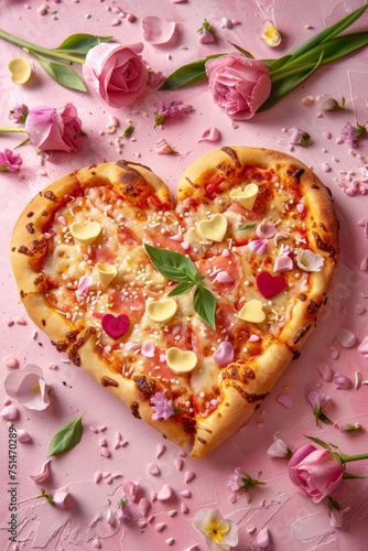 Delightful heart-shaped pizza surrounded by flowers and romantic valentine adornments on a pink surface