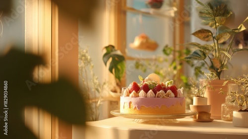 Delightful Strawberry Cake on Display in a Softly Lit Pastel Kitchen With Natural Plants