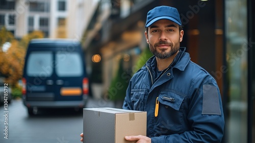 Delivery person holds package outside near van, professional and ready. Courier brings package for fast, reliable delivery service.