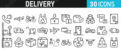 Delivery service icon set. Order tracking, delivery home, warehouse, truck, scooter, courier and cargo icons vector collection