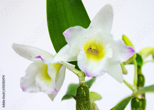 Dendrobium nobile orchid near white wall at home. Close-up, selective focus.