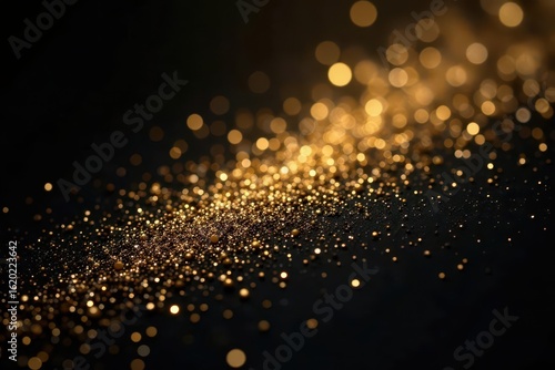 Dense gold glitter scattered on black, creating a shimmering texture , bright, sparkle, texture