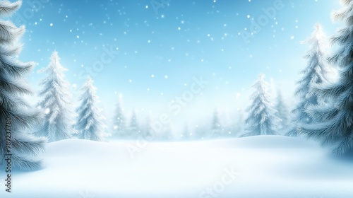 Dense winter forest background with towering, snow-covered pine trees, soft snow falling, and a clear blue sky overhead.