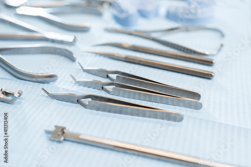 Dental tools and artificial jaw model for the orthodontic treatment lying on the table at the dental office, close-up. High quality photo