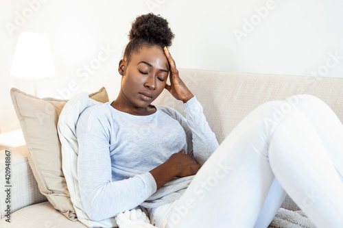 Depressed black young woman sit on sofa down upset having personal relationships problems, stressed millennial african American girl touch head feel despair mourning or grieving of loss