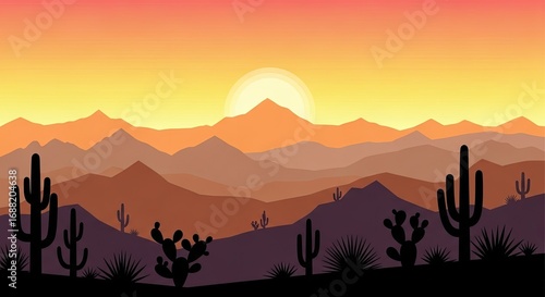Desert Sunset Landscape with Silhouetted Cacti and Mountains in Flat Design Vector Art