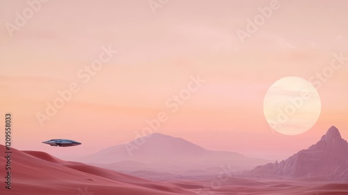 Desert Sunset with Spaceship: A futuristic spaceship soars over a serene desert landscape under a massive, pale sun. The scene evokes a sense of mystery and exploration, a journey to the unknown.