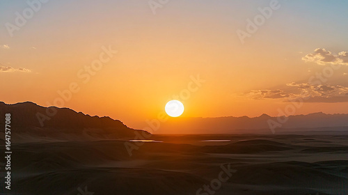 Desert Sunset with Sun and Mountain Silhouette