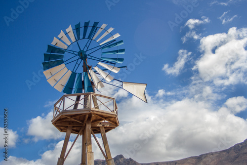 Desertic landscape. Windmill with blue and white blades. Mountains in the background. Yellow sand dunes with desert plants. Blue sky with white fluffy clouds. Famara Beach, Lanzarote, Canary Islands,