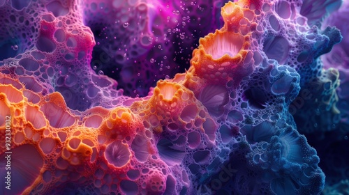 Design an abstract landscape featuring captivating color formations in a microscopic view. Emphasize both scientific detail and artistic flair in the visualization
