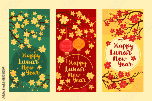 Design of festive money envelopes for Lunar New Year. Asian lanterns, spring branches with apricot or cherry flowers. Red, green and yellow envelopes.