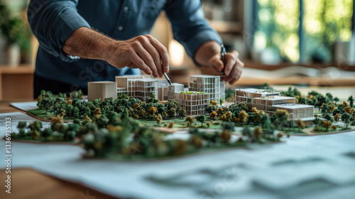 Designing eco friendly buildings with focus on sustainability, team of engineers collaborates on detailed architectural model. scene captures creativity and innovation in urban planning