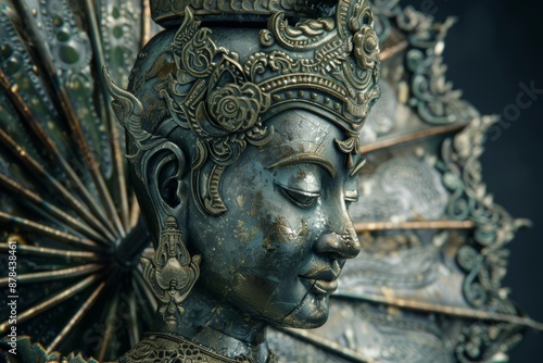 Detailed 3D render of Indonesian female art statue holding umbrella, sculpted from colorful textured stone and adorned with elaborate painted patterns, set against black background.