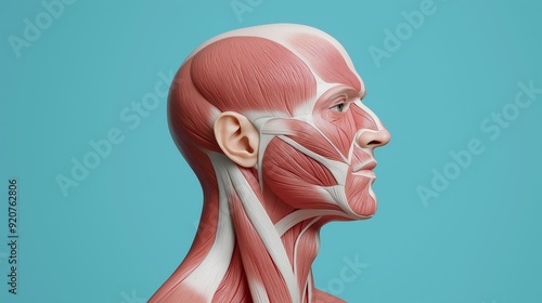 Detailed anatomical model showcasing human facial muscles against a vibrant background, ideal for educational and medical purposes.