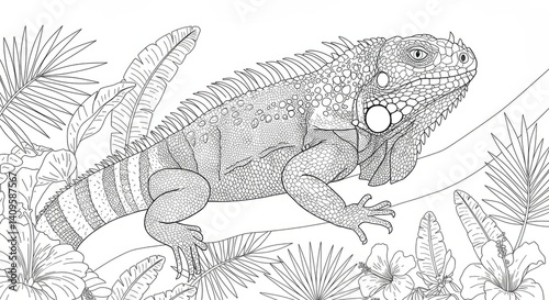 Detailed Black And White Stippling Drawing Of A Reptile In Lush Vegetation