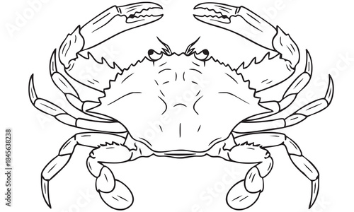 Detailed Black Outline Drawing of a Wide Blue Crab with Large Claws