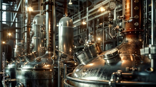 Detailed close-up of a distillery with stainless steel distillation equipment, spotlights.
