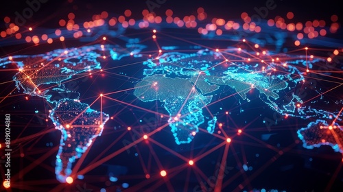 Detailed illustration of a global network, showing interconnected points across a map of the world, highlighted by beams of light, symbolizing connectivity