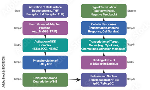 Detailed NF κB Signaling Pathway Flowchart, Science Vector Illustration on White Background.