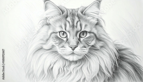 Detailed pencil drawing of a majestic Maine Coon cat, showcasing its striking facial features and long, flowing fur.