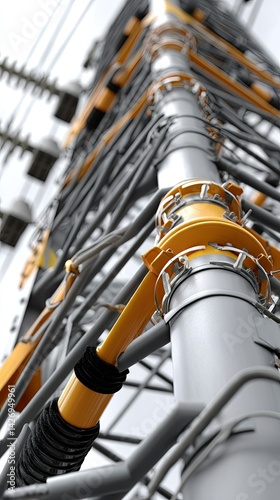 Detailed view of industrial power line infrastructure against a cloudy sky, showcasing the complexity of electrical transmission systems