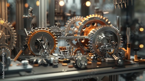 Detailed visualization of a financial strategy optimization, shown as a digital workshop with tools fine-tuning a complex mechanism of gears and levers