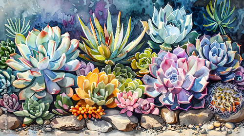 Detailed watercolor of a succulent garden, colorful cacti, sedum, crassula, soft morning mist ,Ultra-High Detail, Ultra-Realistic