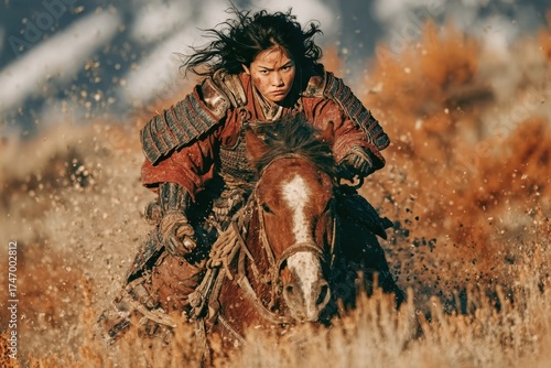 Determined Japanese woman riding a muscular horse through rugged terrain