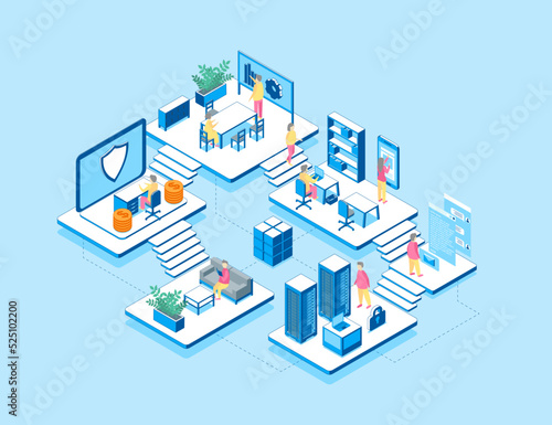 Development Company Business Concept 3D Isometric View. Vector illustration of Developer and Creative People in Office