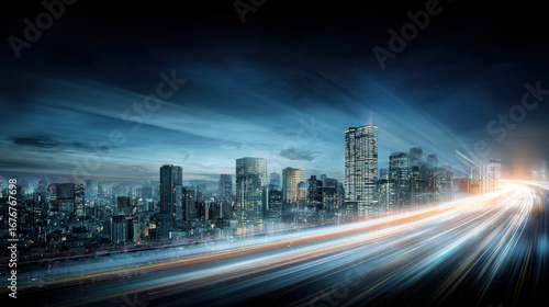 diagonal light streaks over cityscape blurred silhouette speed and innovation idea illustration concept scene visual for commercial design use high detail quality stock image illustration concept