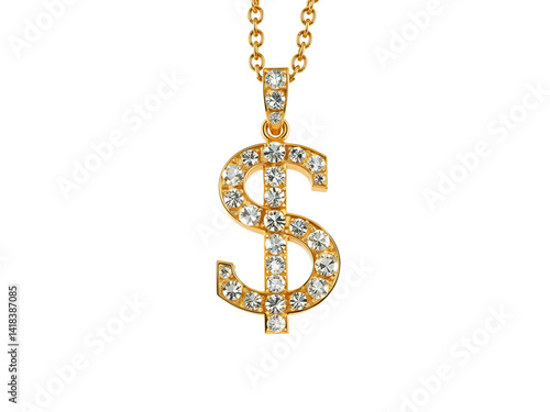Diamond-encrusted gold dollar sign pendant on chain, symbolizing wealth, luxury, and financial success. Generative AI