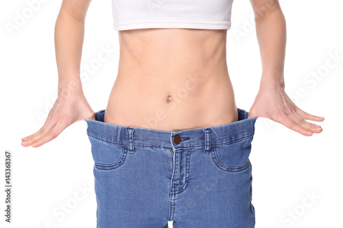 Diet concept. Young beautiful woman in large jeans on white background