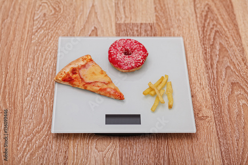 Diet. The concept of junk food on weight. Healthy Lifestyle. Wooden background.