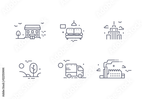 Different buildings icon set for real estate agency. Property collection. Thin line design. Flat style.