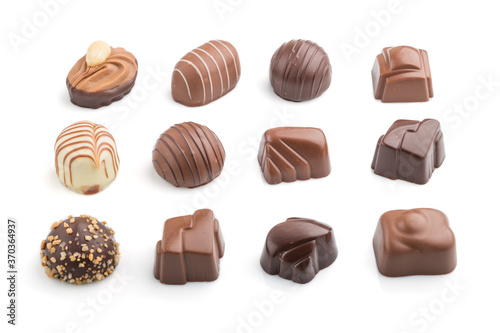 Different chocolate candies isolated on white background. side view.