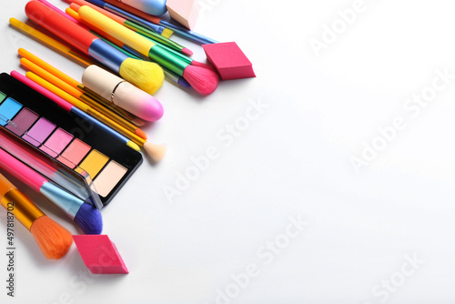 Different cosmetics and makeup brushes isolated on white