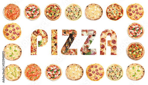 Different delicious pizzas and word on white background