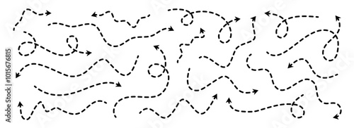 Different dotted thin arrows set. Wavy and curved dashed pointers collection. Wiggly sketchy direction lines. Dots squiggle loop stripe design elements bundle for flyer, poster, brochure. Vector